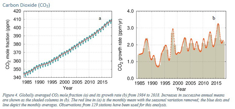 Carbon dioxide is the main long-lived greenhouse gas in the atmosphere related to human activities. Its concentration reached new highs in 2018 of 407.8 ppm, or 147% of pre-industrial level in 1750.