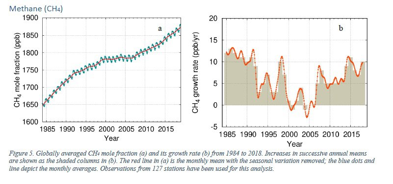 Methane (CH4) is the second most important long-lived greenhouse gas. Atmospheric methane reached a new high of about 1869 parts per billion (ppb) in 2018 and is now 259% of the pre-industrial level.