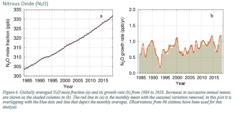 Nitrous oxide also plays an important role in the destruction of the stratospheric ozone layer which protects us from the harmful ultraviolet rays of the sun. Its atmospheric concentration in 2018 was 331.1 parts per billion. This is 123% of pre-industrial levels..