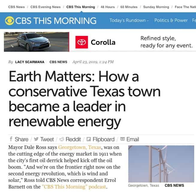 Mayor Dale Ross says Georgetown, Texas, was on the cutting edge of the energy market in 1911 when the city’s first oil derrick helped kick off the oil boom. “And we’re on the frontier right now on the second energy revolution, which is wind and solar,” Ross told CBS News correspondent Errol Barnett on the “CBS This Morning” podcast.