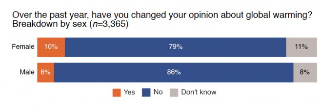 To try to explain this gender gap, Marlon pointed to a Yale analysis from 2018 that showed American women tend to be a bit more worried about global warming than men. Women also report having less certainty about the science behind it. The less sure we are about our opinions, the more easily we can be swayed by evidence.
