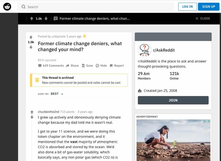 In the Reddit thread titled “Former climate change deniers, what changed your mind?” the most popular comment comes from chucklesthe2nd (probably not his real name). Chuck, as we’ll call him, essentially inherited his dad’s views on climate change.