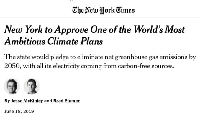 “New York lawmakers have agreed to pass a sweeping climate plan that calls for the state to all but eliminate its greenhouse gas emissions by 2050, envisioning an era when gas‐guzzling cars, oil‐burning heaters and furnaces would be phased out, and all of the state’s electricity would come from carbon‐free sources.