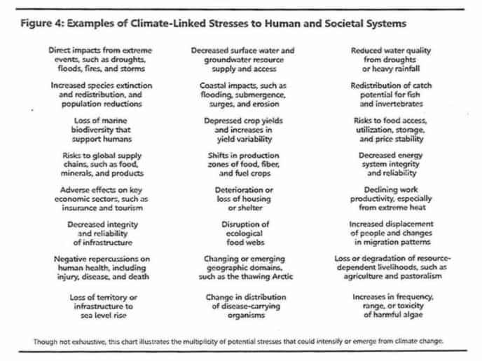 Fundamental characteristics of the global climate are moving outside the bounds experienced in human history and there is uncertainty on how some aspects of the climate will evolve. Given the social and political contexts in which a multitude of changes are occurring, however, we can expect new and compounded stresses on people and societies around the world, many with outcomes important for national security.