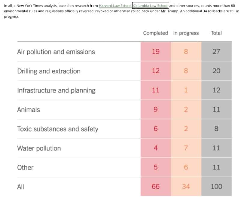 In all, a New York Times analysis, based on research from Harvard Law School, Columbia Law School and other sources, counts more than 60 environmental rules and regulations officially reversed, revoked or otherwise rolled back under Mr. Trump. An additional 34 rollbacks are still in progress.
