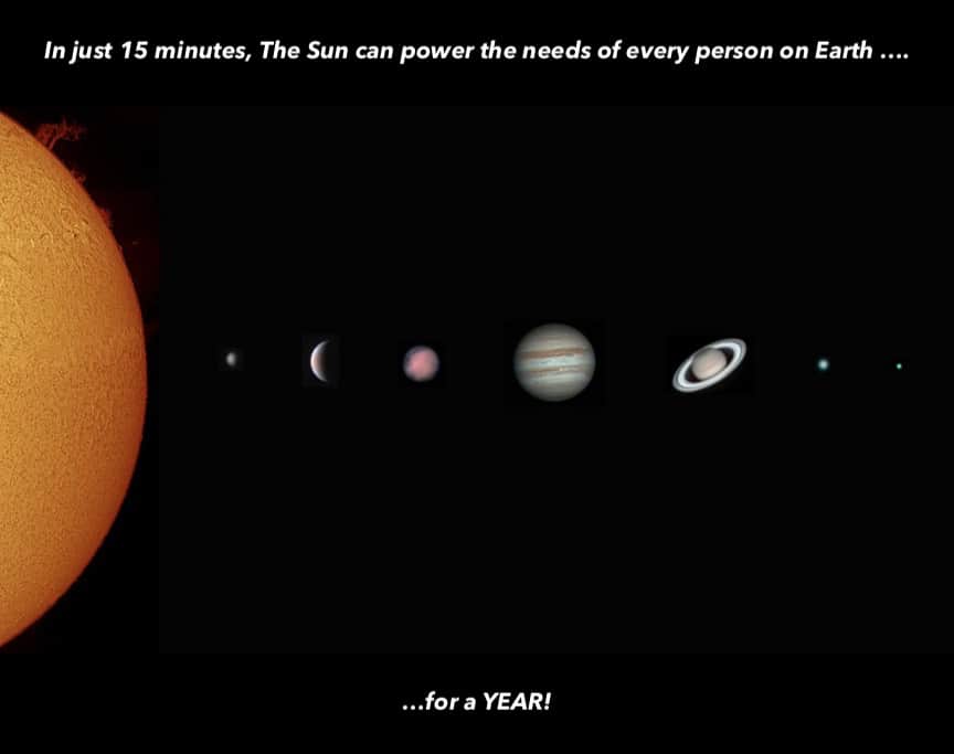 The Sun delivers enough energy to planet Earth in just FIFTEEN MINUTES to run EVERYTHING you use that needs power for a WHOLE YEAR!